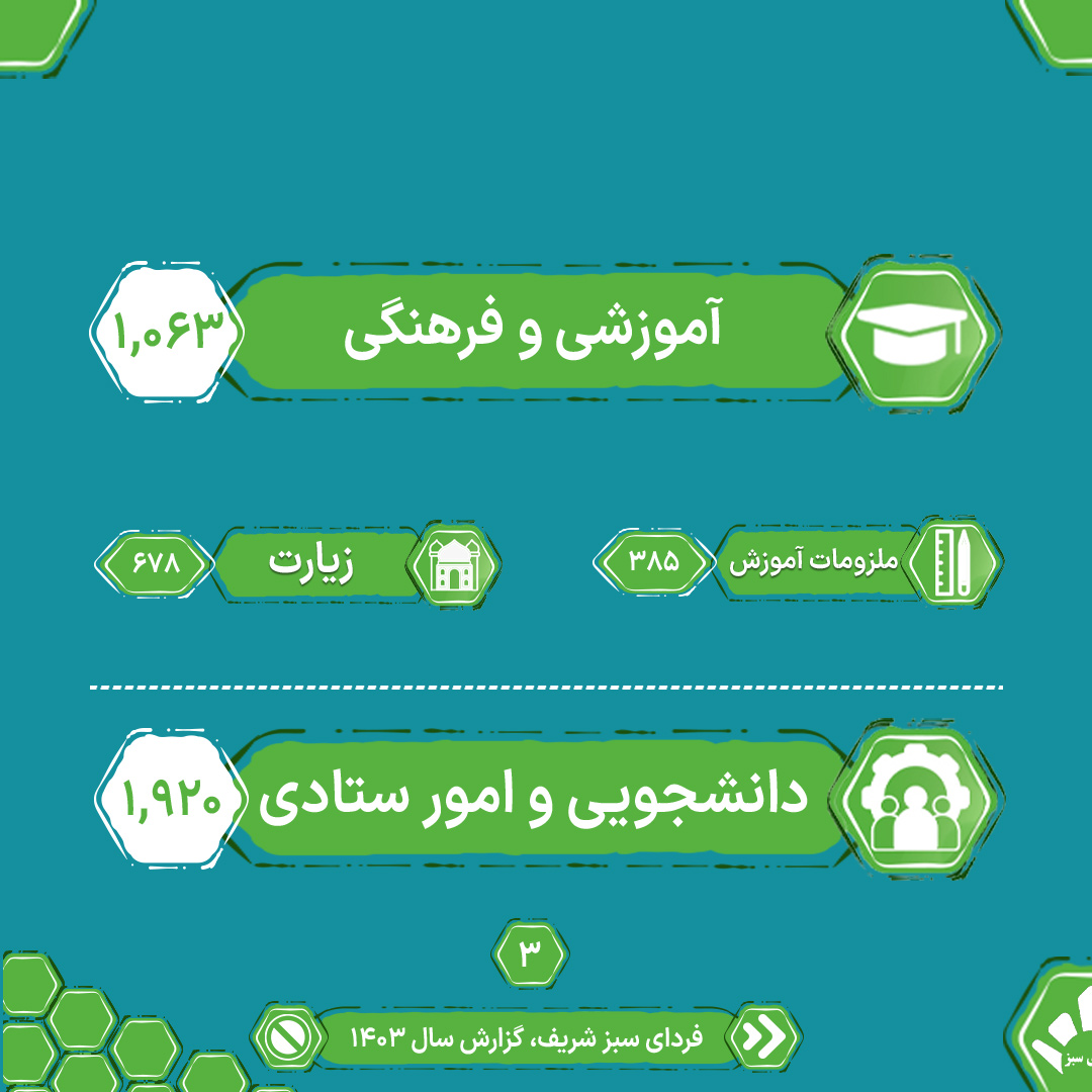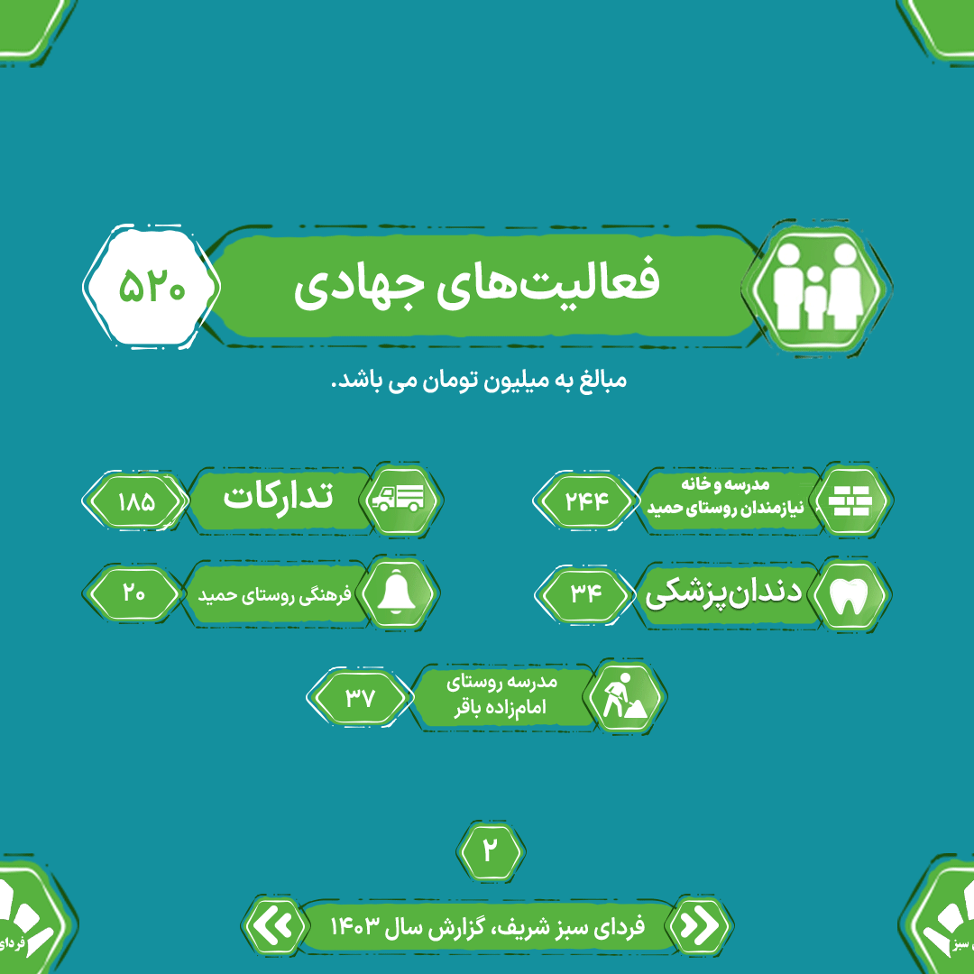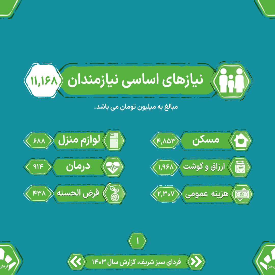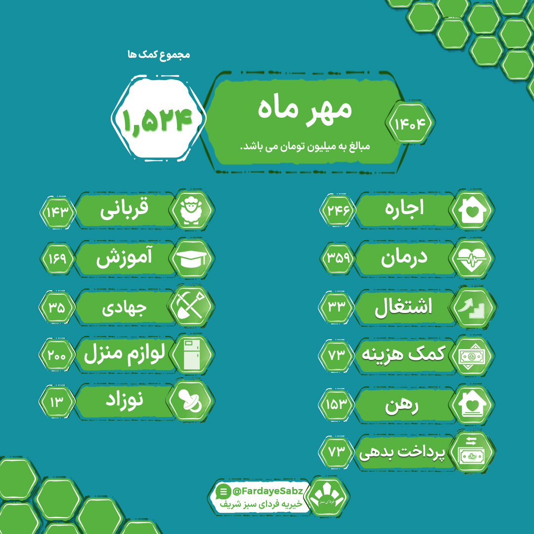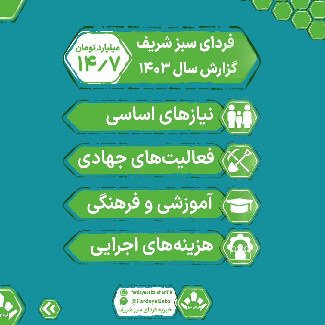 به لطف الهی و همت خیرین عزیز در سال 1403، کمک ها و فعالیت های خیریه فردای سبز شریف به منظور رسیدگی به مناطق محروم و دستگیری از خانواده های نیازمند همچنان ادامه داشت و در بخش رسیدگی به نیازهای اساسی خانواده های نیازمند از جمله: تامین مسکن، ارزاق و گوشت، هزینه های عمومی زندگی، درمان، قرض الحسنه و در بخش کمک به زلزله زدگان و فعالیت های جهادی
