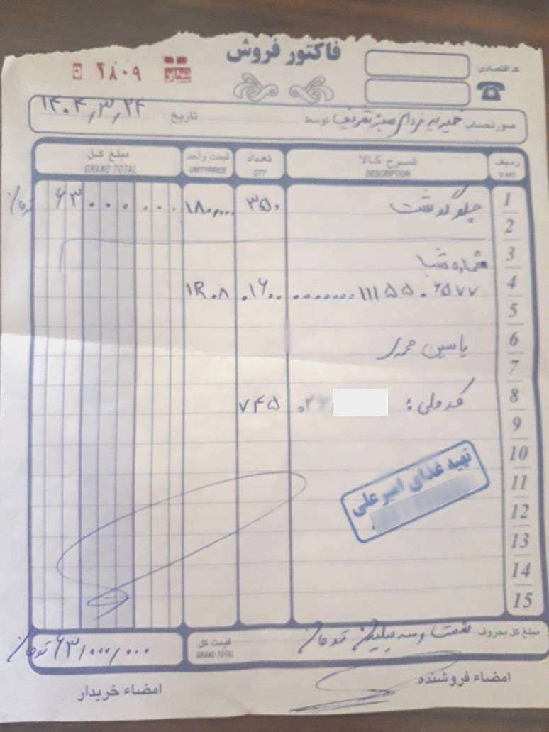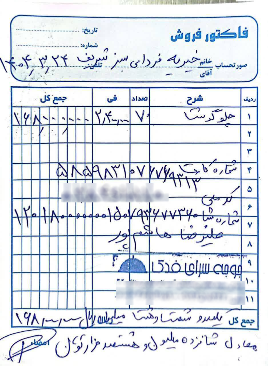 10 میلین تومان: هزینه خرید گوشت (برای جشن دوم که مواد اولیه توسط خیرین تهیه و غذا توسط فعالین خیریه در مناطق محروم تحت پوشش برای خانواده های کم برخوردار طبخ گردید.)