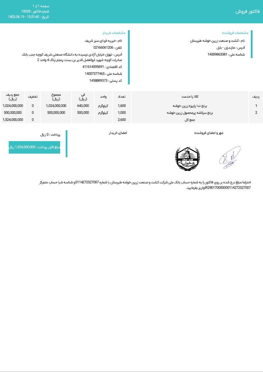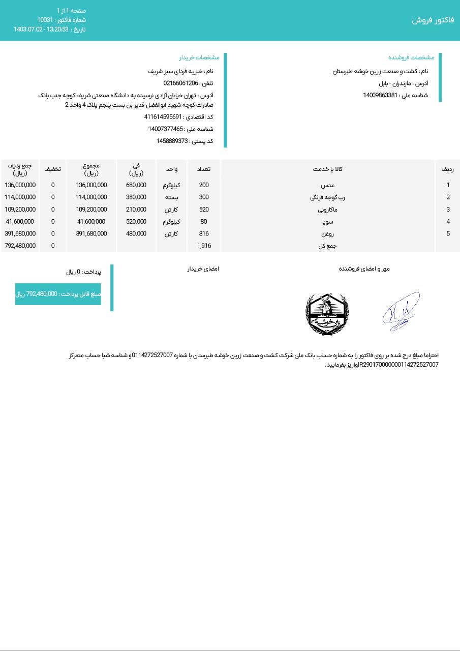 | 1 | برنج | 5 | کیلو | 58،500 |