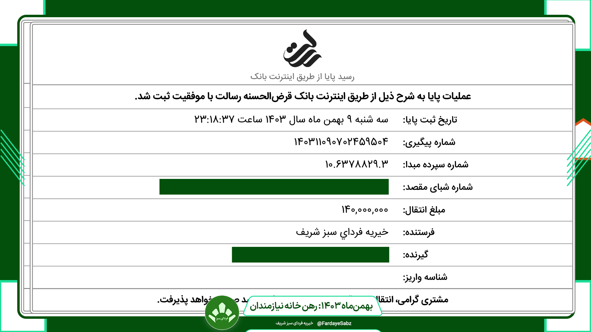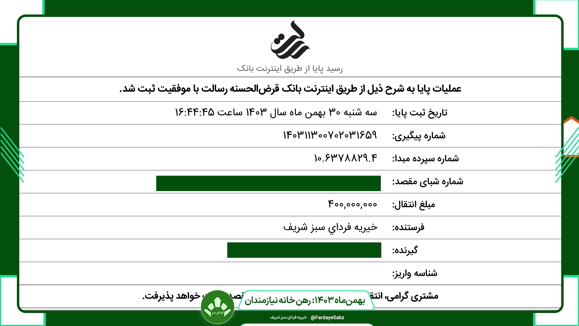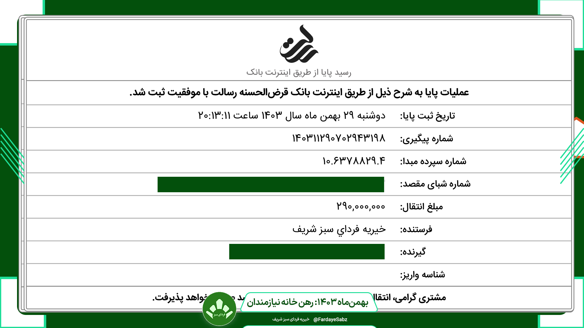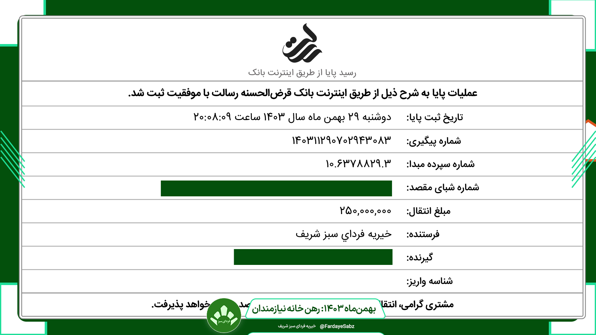 خیریه فردای سبز شریف گزارش مالی بهمنماه 1403