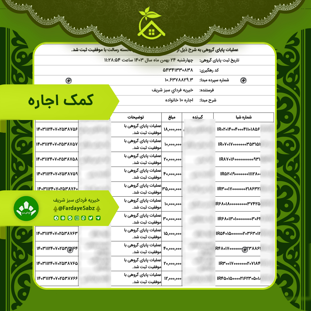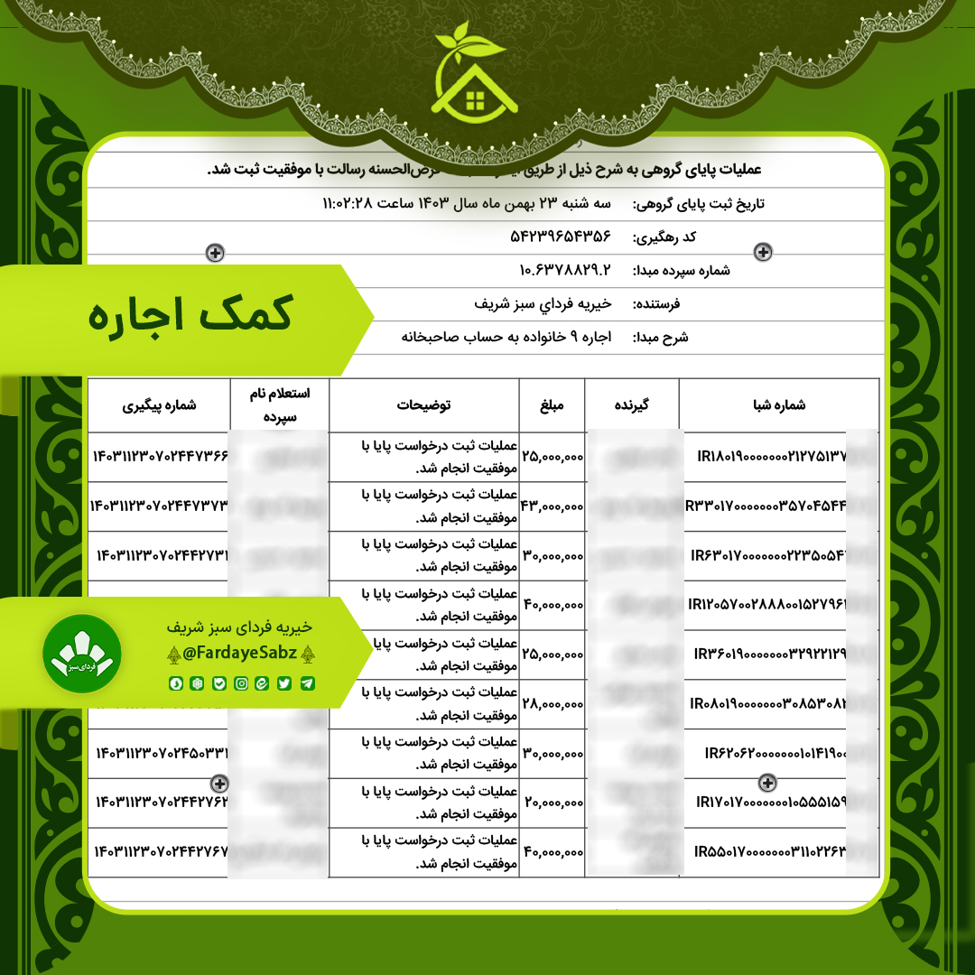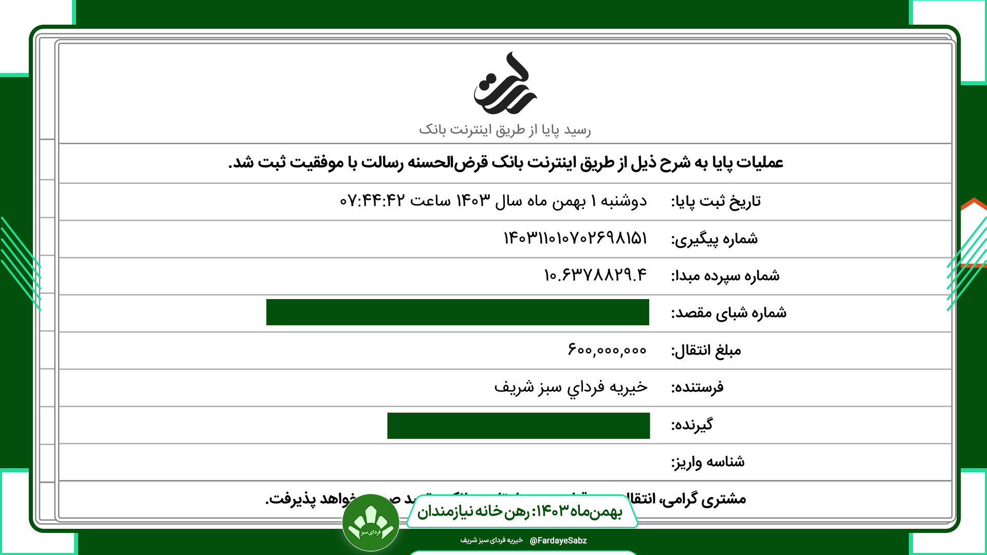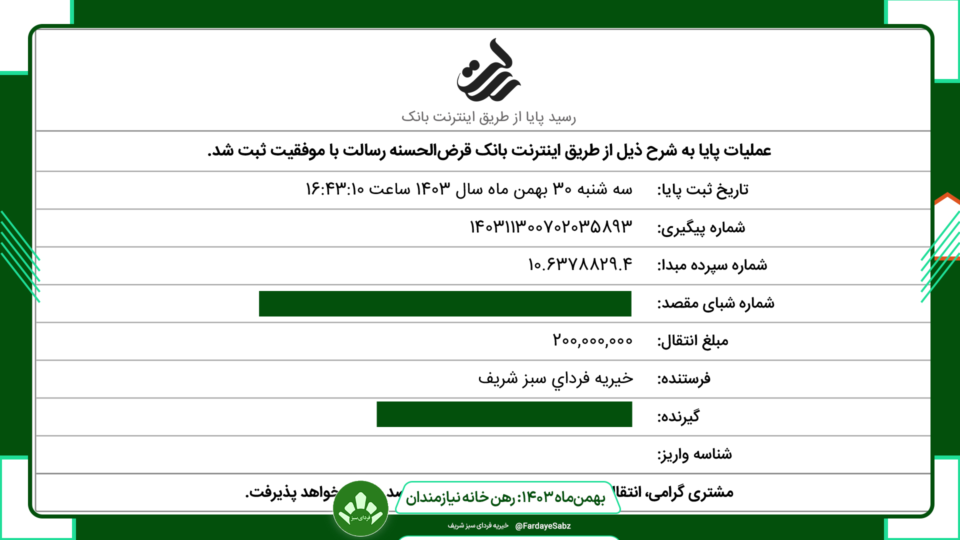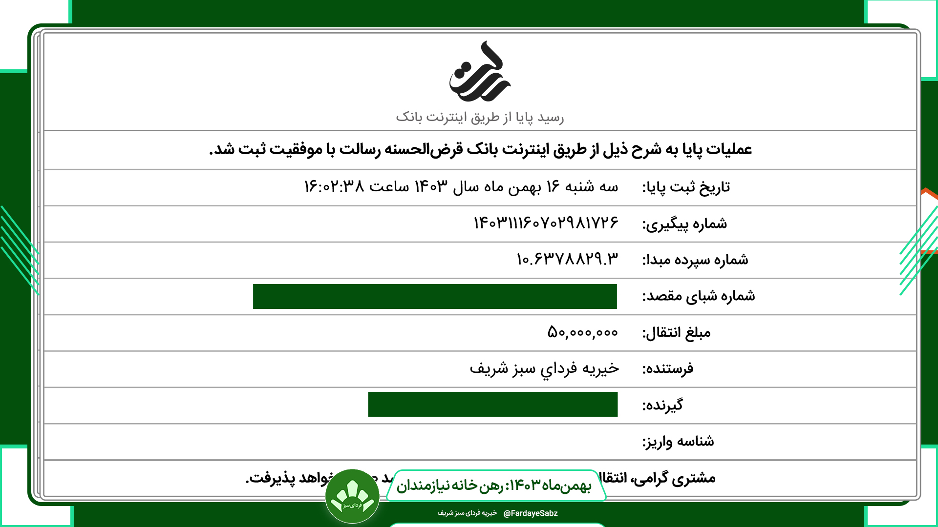 خیریه فردای سبز شریف گزارش مالی بهمنماه 1403
